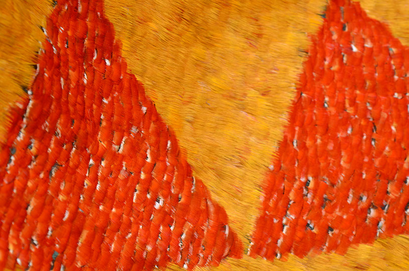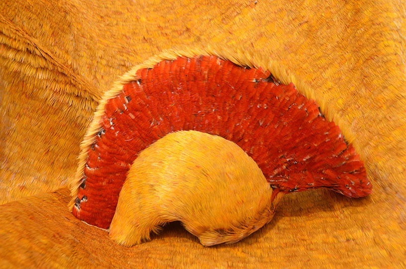 This magnificent cloak is the creation of renowned feather worker Rick San Nicolas. It is made with individual Chinese Golden Pheasant feathers (the equivalent of 685 birds), in addition to nearly 50,000 feathers from the Lady Amherst Pheasant (the equivalent of 1,700 birds). All feathers were ethically sourced as a bi-product of pheasants grown for food.